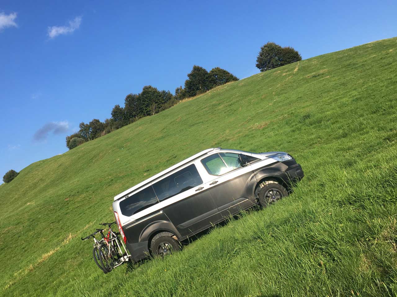 Problemlos schiebt sein 170 PS starker Motor das kleine Wohnmobile jeden steilen Anstieg hinauf, sobald das ESP anschlägt wird der Antrieb automatisch auch auf die Hinterachse zugeschaltet. Ein rechtzeitiger Druck auf den 4x4 Lock-Knopf schaltet den Allrad manuell zu und sorgt so dafür dass nicht erst Spuren hinterlassen werden.